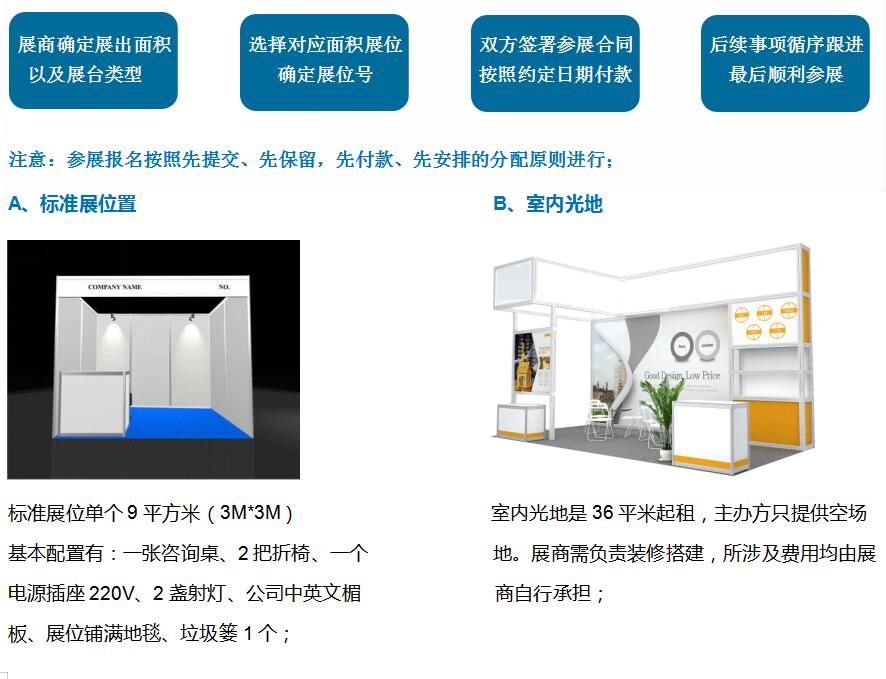1)36平方米起租,不配备任何设施。 2)参展商须选择组委会指定搭建商进行搭建。 |